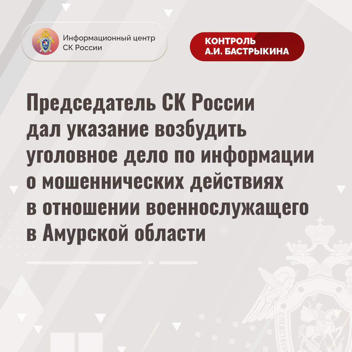 Председатель СК России дал указание возбудить уголовное дело по информации о мошеннических действиях в отношении военнослужащего в Амурской области