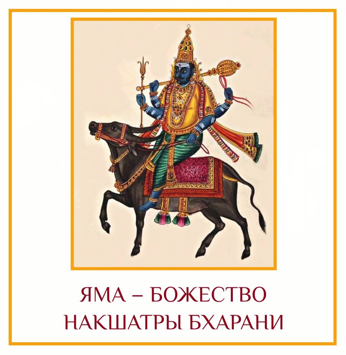 Божество/дэвата накшатры Бхарани – бог смерти Яма. Яма принимает решение о вашем пути после окончания воплощения, основываясь на ваших поступках. Вы обнаружите, что честность и чувство справедливости всегда будут присутствовать у натива Бхарани. Именно Яма уносит душу в другой мир после физической смерти, и он считает этот поступок долгом/дхармой. Поэтому Яму также называют богом Дхармы. Люди Бхарани в своей жизни переживают опыт, близкий к смерти, поскольку Яма часто напоминает им следовать праведным путём, ведь их ждет новое воплощение. Яма учит нас отстранённости от мирских удовольствий после определённых несправедливых событий в жизни. Такая тенденция может проявиться очень рано, если даша планет, расположенных в Бхарани, наступит в раннем возрасте. Здесь смерть — это не только смерть физической формы, но и смерть вашей жадности, желаний, отношений и так называемых материальных амбиций. Яма был первой личностью, который обнаружил подлог теневой версией матери Санджаны и стал врагом