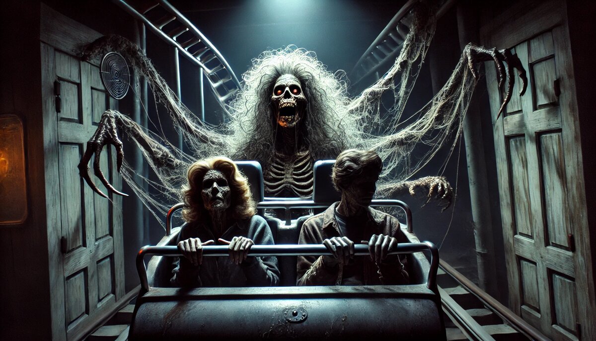 Вагончик двинулся дальше. Новая сцена: к кухонному столу, покрытому веселенькой скатертью, была привязана — тонкой, распоровшей кожу проволокой, за запястья и лодыжки к ножкам — молодая женщина на позднем сроке беременности. Ее нижняя челюсть была полностью вырвана, вывалившийся язык — неожиданно большой с точки зрения тех, кому никогда не доводилось наблюдать человеческий язык _целиком_ — походил на жирного дохлого моллюска. А неопрятного вида волосатый и бородатый тип длинным, острым на конце кухонным ножом яростно бил, бил, бил в ее огромный беременный живот. С каждым ударом из разодранной дыры, некогда бывшей ртом женщины, выплескивался сгусток крови, но самым жутким было не это. Было отчетливо видно, как под кожей ее живота, туго натягивая ее то здесь, то там, конвульсивно ходят словно бы крупные желваки. Плод был все еще жив — хотя, по идее, уже первый такой удар должен был стать смертельным — и корчился и извивался каждый раз, когда нож вонзался в него. То рука, то нога растягивала живот матери так, что тот, казалось, вот-вот лопнет — тем более что он и так был в разрезах от ножа, которые вытягивались багровыми дырами; а в том момент, когда вагончик вновь тронулся с места, Майк отчетливо увидел сквозь кожу черты прижавшегося изнутри лица с разинутым ртом...