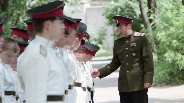 Линейка как линейка — пойди в любую школу на первое сентября и услышишь то же. Про то, в какое замечательное учебное заведение пришли дети и какие чудесные перспективы их ждут. Батюшка в черной рясе окропил ребят святой водицей и пожелал «крепости, послушания и смирения». Единственное отличие — ни одного бантика, ни одной косички — чисто мужской коллектив. А вместо классных руководительниц ребят сопровождали офицеры в мундирах, будто из фильмов про царскую Россию.