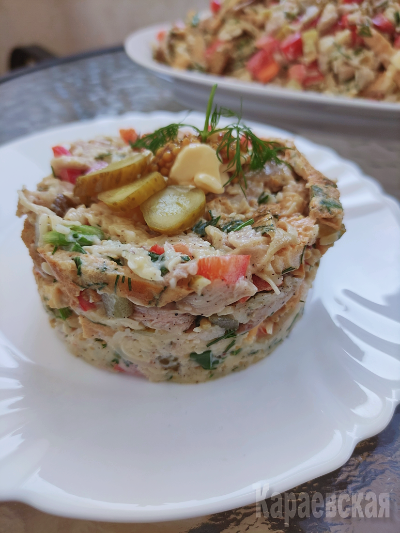 В салатнике соединить нарезанное куриное мясо, огурцы, натертый сыр, болгарский перец и нарезанные яичные блинчики. Добавить зелень, соль и перец. Перемешать и заправить майонезным соусом.