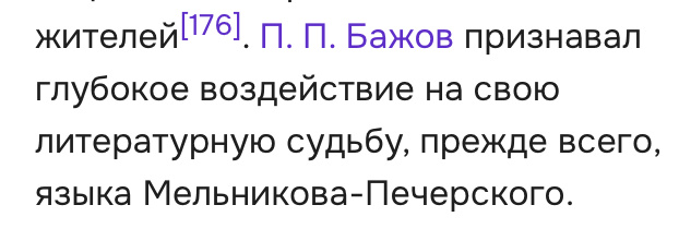 Википедики продолжают радовать. Сообщили вот, что "П.П.Бажов признавал глубокое воздействие на свою литературную судьбу, прежде всего, языка Мельникова-Печерского". Самое время вспомнить призыв Булата Окуджавы: "Живописцы, окуните ваши кисти!" Окунуть, расчехлить мольберт — и взяться за полотно "Павел Иванович Мельников-Печерский глубоко воздействует языком на литературную судьбу Павла Петровича Бажова"...