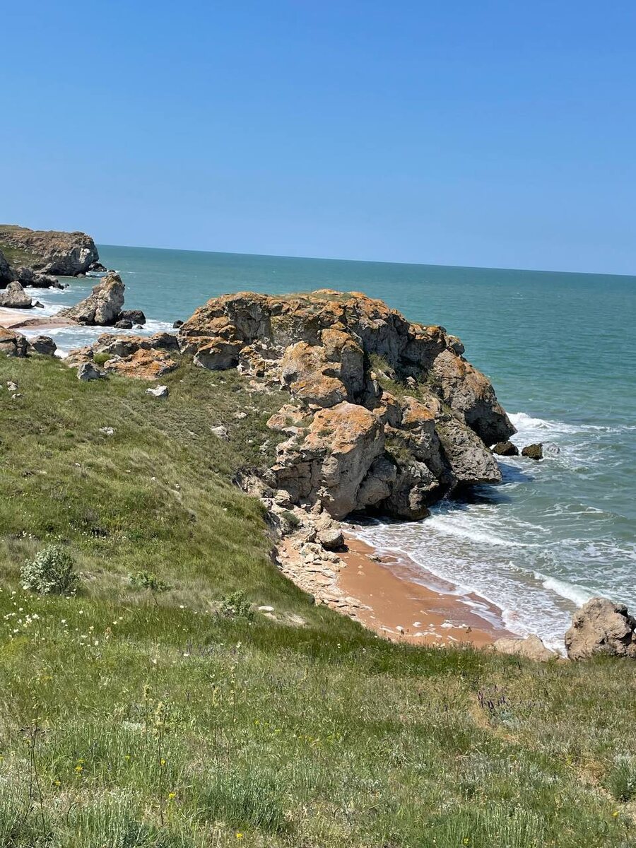 Июнь. Поездка на Генеральские пляжи, Ленинский район, северо-восток Крыма. Часть Караларского заповедника с изумительными бухтами, окруженными скалами на Азовском море. Каждая бухта уникальна, различна по размеру и имеет своё название: Лисья, Коровья, Шелковица и другие. Я провела своё детство на побережье Азовского моря (там, где глина и целебная грязь) и привыкла видеть его другим. А здесь море прозрачное и чистое. И берег песчаный с узнаваемой крупной ракушкой. Когда поднимается ветер, золотые песчинки танцуют в морской воде, будто окрашивая воду в золото...