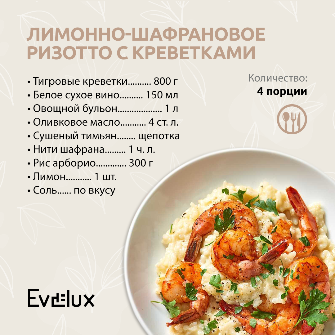 Когда хочется насладиться настоящей итальянской кухней, то стоит приготовить ризотто. Это блюдо с кремообразной консистенцией, приготовленное из риса, но сохраняющее его форму и текстуру. Обычно ризотто готовят с морепродуктами. Например, лимонно-шафрановое ризотто с тигровыми креветками. Благодаря шафрану оно приобретает золотистый оттенок, а лёгкая кислинка от лимона добавляет ему особый вкус.