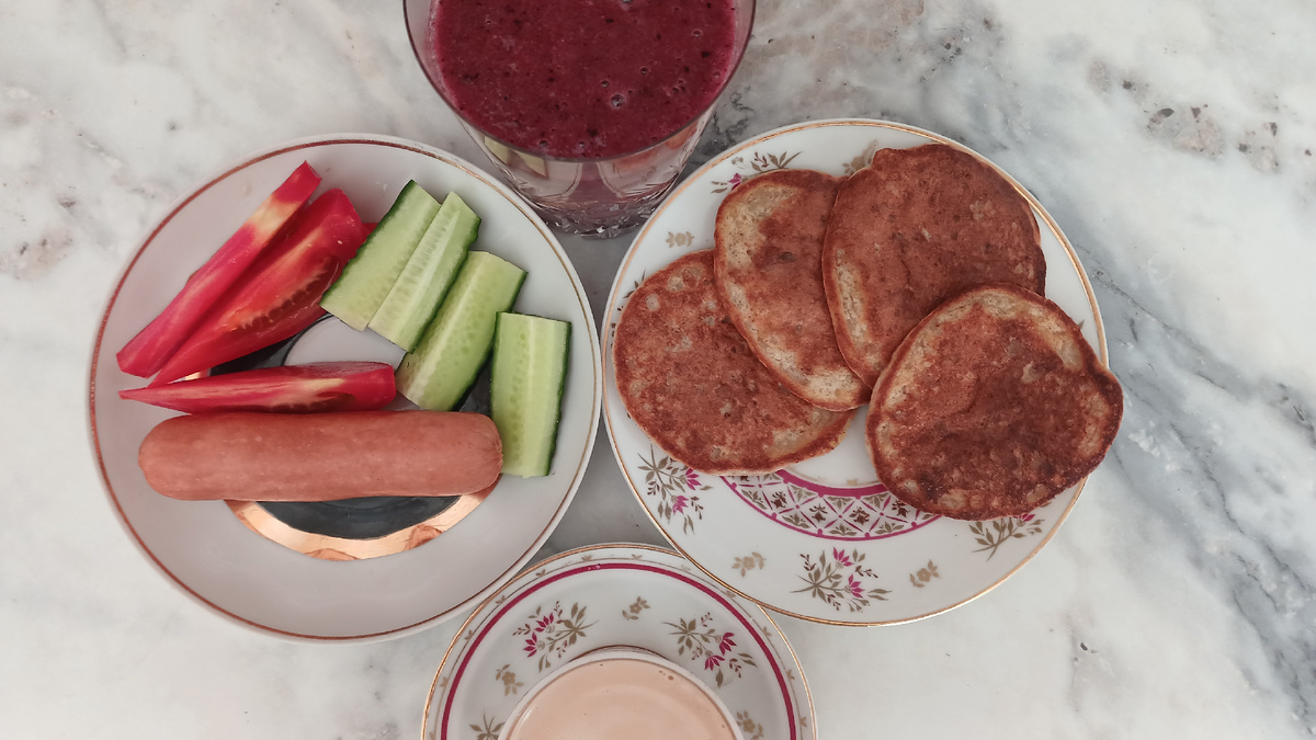 Экономное питание на 226 руб в день "Зависла" в холодильнике порция овсяной каши. Приготовила на ней оладьи к завтраку. К оладьям открыли баночку варенья, которое получали в подарок на Московском чаепитии Сварила сосиски (Вкусвилл), к ним огурцы и помидоры И взбила в блендере смузи, собрала для него бананы, кабачок, нектарины и пару горстей черники положила для вкуса и красивого цвета После завтрака мы с мужем уехали по делам. Заодно заезжали в магазин Вимм-Билль-Данн и на Лианозовский рынок. Обедали уже на скорую руку, суп было некогда варить. На обед творог со сметаной, манго и голубикой, творожные шоколадные сырки, мажитель и потом, после обеда -кофе с инжиром и сыром на ужин - паста с семгой и форелью в сливочном соусе и овощной салат Заказывала рыбный набор из Вкусвилла. Был похуже, чем раньше привозили. Всего один хороший хвостик-филе, пара непонятного размера стейков (один - крупный и несколько малюсеньких совсем) и остальное хребты и голова. Все стейки я филировала и пригото