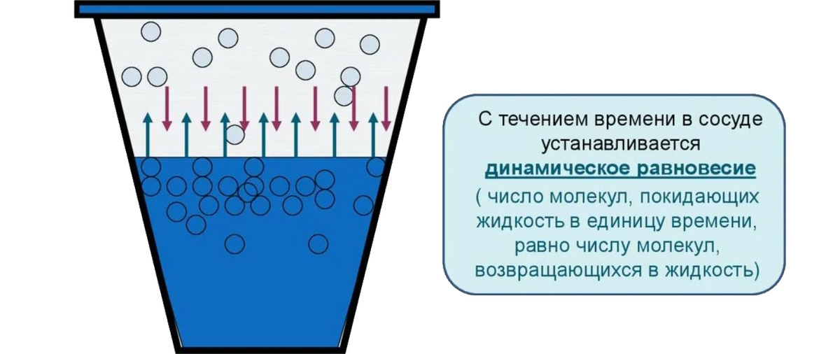 Динамическое равновесие между паром и жидкостью наступает в том случае, когда количество покидающих жидкость молекул равно количеству возвращающихся в жидкость молекул.