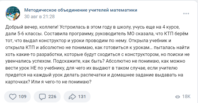 Накануне 1 сентября учителя поняли, что в предстоящем учебном году подготовка к урокам математики по крайней мере в 6 классе будет занимать львиную долю времени, которого и без того нет; ведь первые 8 уроков (это в Москве, а где-то и все 20 уроков) по Федеральной образовательной программе не соответствуют НИ ОДНОМУ УЧЕБНИКУ 6 класса. А это значит, дорогие родители, что учебник первые две недели можно не носить: всё равно там нет таких заданий, которые бы соответствовали ФОПу! Вот и рыдают сейчас учителя: что делать? "Никто не понимает. Ситуация полный абсурд, но нас никто не слышит. Выкручиваемся…" "Господи , какая неразбериха! УЧИТЕЛЯ!!!!! Что происходит?!! Что же это получается? Нет в руководстве образования людей, которые здравом мыслят???? Почему в управлении образованием работают люди, не работающие в школе…. Это ужас, что происходит …. Я в шоке… а если в школу пришел молодой педагог, откуда ему знать в какой последовательности вести уроки??? Он же сам еще вчера выпускник школы …