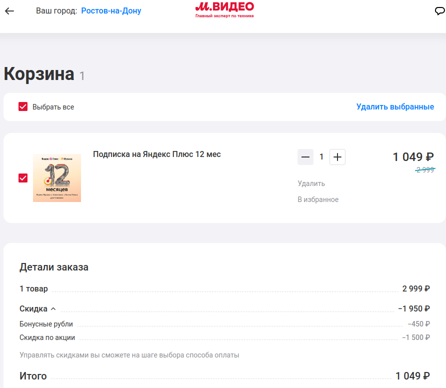 М.Видео и Эльдорадо сейчас предлагают такую подписку за 1499 руб. Многим начислили в последнее время по 2000-3000 бонусов МВидео/Эльдорадо, с которыми цена опускается до 1049 руб. Также за такой заказ начислят 105 бонусов. После покупки МВидео/Эльдорадо высылает код активации на электронную почту и по СМС на телефон. В СМС при этом указан сайт mvideo.ru/code , на котором нужно активировать цифровой код подписки (в письме на электронную почту такого адреса почему-то не указывают). После перехода на этой стра