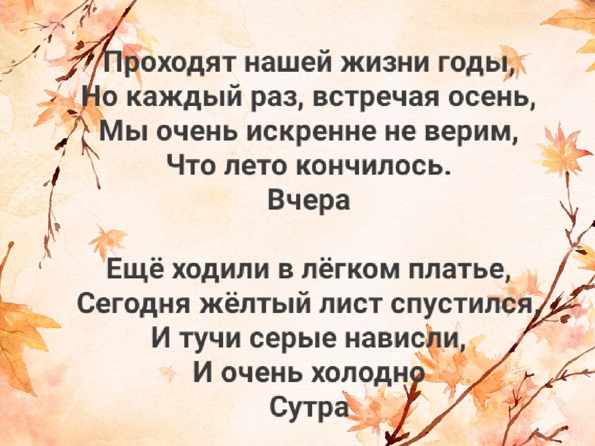 И я вспомнила, что у меня красивые стихотворения имеются про осень 😊 И захотелось с вами поделиться. Вот это, например, написано прошлой осенью. Вообще, осень - такое время года, когда у многих писателей появляется вдохновение. Со школы ещё помнятся изученные стихи про осень наших известных поэтов. Унылая пора! Очей очарованье! Приятна мне твоя прощальная краса — Люблю я пышное природы увяданье, В багрец и в золото одетые леса... Помните, я тоже как-то писала, что под конец года охота что-то успеть сделать? И осень - как раз то время, когда эти желания начинают появляться в голове. Пару лет назад, когда нужно было сделать поделку в садик с дочкой, мне пришло в голову написать акростих к нашей поделке. И я написала. А моё последнее стихотворение про времена года так и называется Сезонов хоровод 👇 Что бы мне такого интересненького напридумывать этой осенью? 🤔 Время покажет 😉