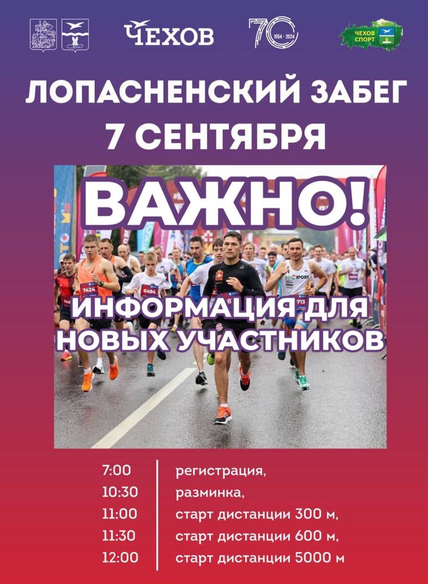❗️ Напоминаем, что 7 сентября 2024 года в честь празднования Дня города Чехов состоится масштабный праздник бега — «Лопасненский забег».