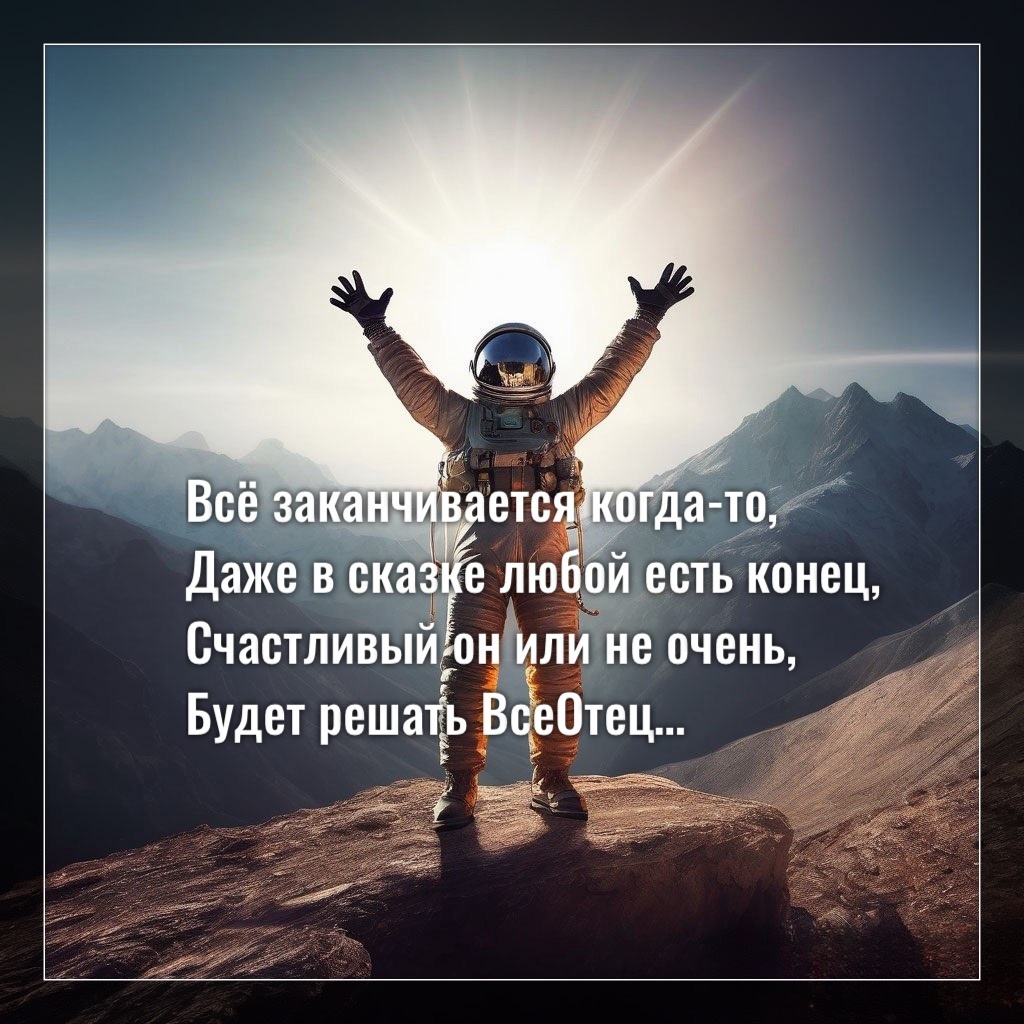Всё заканчивается когда-то, Даже в сказке любой есть конец, Счастливый он или не очень, Будет решать ВсеОтец, Хоть человек влияет На то, что с ним здесь происходит, Кто-то в капкан попадает, А кто-то на свет выходит, Лишь по подсказке Высших, Никто не вершитель судьбы, Важно не потерять связь, Чтоб не возникло беды. Когда ты не слышишь Бога, Который тебя ведёт, Тот, кто о Нём забывает, Душу свою продаёт. А дальше пути назад нет, Им тёмные повелевают, Куда-то пропала любовь, Его больше не понимают, Меняется круг общения, Рушится медленно всё, Это не Бог виноват, Может быть хуже ещё, Но Души не понимают, Чувствуя власть, в забвении Теряют свой свет окончательно, Потом будут бегать в смятении, Что больше не получается Чего-то на свете достичь, Помните, что очень важно С Богом внутри всегда жить.❤️