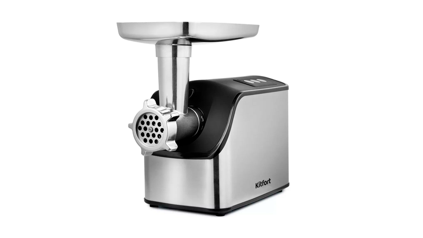 Первое место в нашем рейтинге занимает мясорубка Kitfort KT-2103. Она получила мотор с пиковой мощностью в 1800 Вт, корпус и лоток из металла, а также отличную комплектацию. Относительно конкурентов модель может похвастаться впечатляющей производительностью в 2,3 кг фарша в минуту. Качественные комплектующие дают возможность ей работать без перерыва в течение 5 минут. В комплекте к мясорубке идут пять насадок и три перфорированных диска для фарша. Размер отверстий в них составляет 3 мм. С помощью мясорубки можно приготовить колбасы и сосиски. Насадки для нарезки овощей в комплектации нет. Высота Kitfort KT-2103 дает возможность сбрасывать нарезанный фарш в посуду высотой до 10 см.