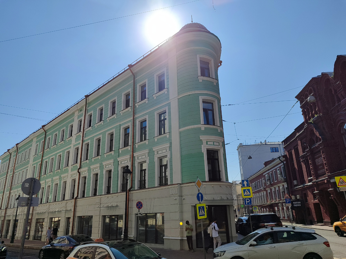 На Большой Никитской, на углу с Малым Кисловским переулком, стоит дом (№17). Малый Кисловский подходит к Большой Никитской под углом. Соответственно и дом получался этаким косым треугольником в плане. Для эстетики угол дома скруглили. На питерский манер. Дом старинный. В 1820-х годах купец Булошников построил. Чем купец занимался? Ну чем можно заниматься с такой фамилией? На первом этаже открыл булочную. Второй- жилой. - А третий?- спросит читатель. Третий надстроили 1886 году. Заодно и фасад немного переделали. Бывший купеческий дом сохранился почти в неизменном виде до начала 1990-х. Пришли новые времена. Пришли новые хозяева. Дом купила некая компания Грин Хаус. - Давайте отреставрируем старое здание- обратились новые хозяева к властям- Пообветшало за столько лет. - Почему бы и нет- согласились власти- Давайте. Подремонтировали. В зеленый цвет покрасили. В соответствии с названием фирмы новых хозяев. Казалось бы, дом ждет спокойная теперь спокойная жизнь. В обновленном виде. Но ведь