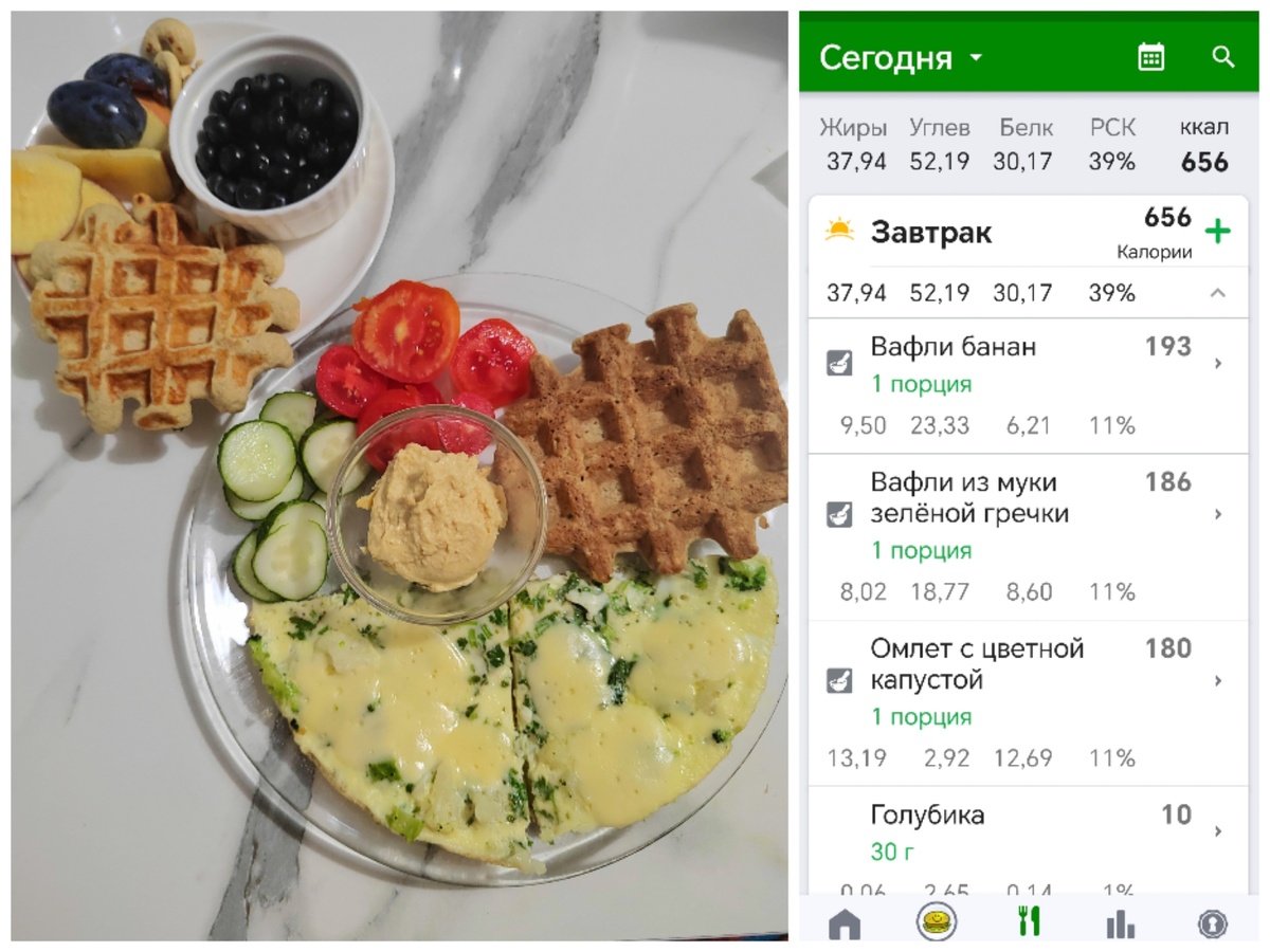 Омлет с цветной капустой и сыром, вафли как кабачковые, вафли банановые, ягоды.
