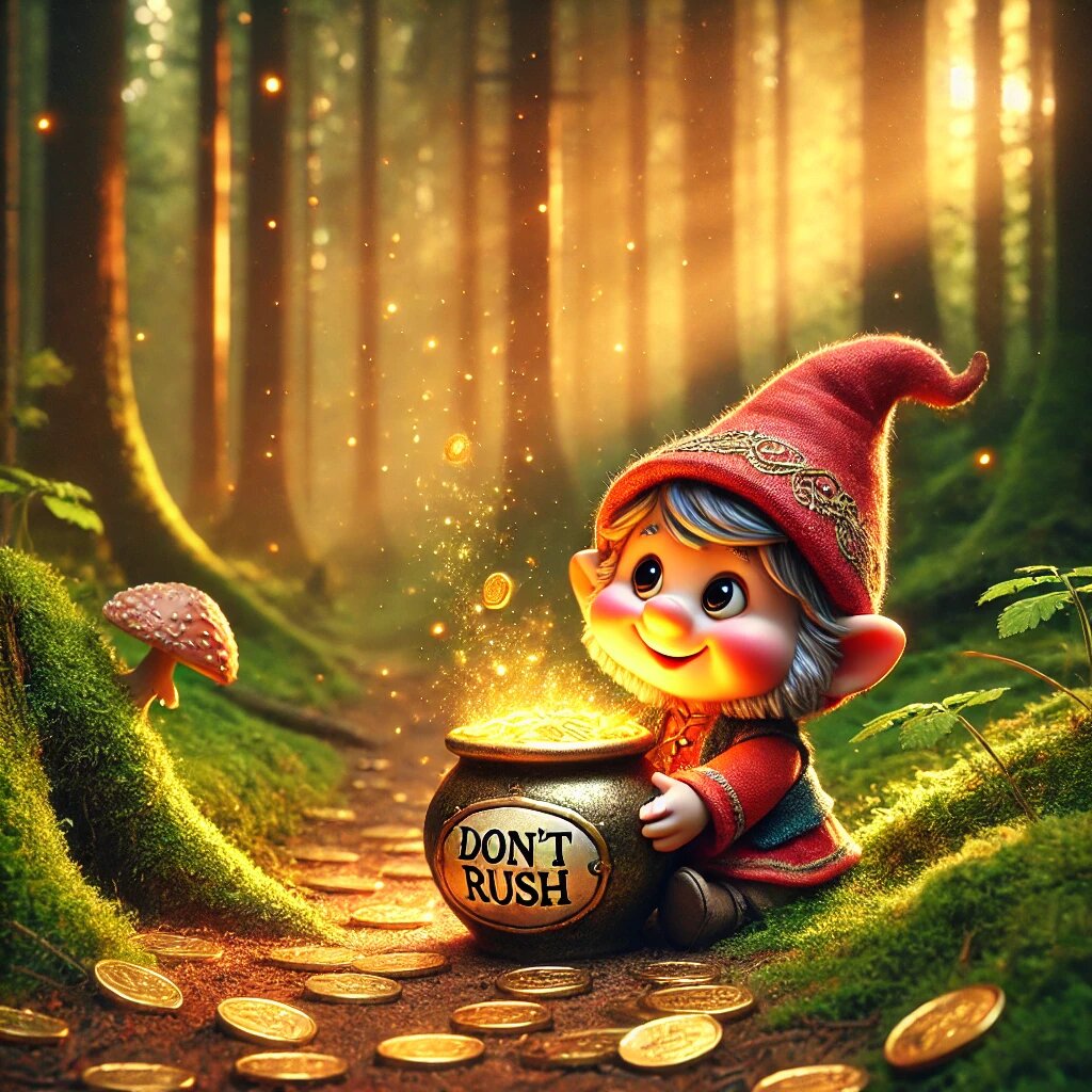 В далёкой-далёкой стране, в горах, жил гном по имени Торопышка. И как можно догадаться, Торопышка всегда спешил. Он был самым быстрым гномом во всей деревне, но его поспешность часто приводила к неприятностям. Однажды Торопышка нашел на лесной тропинке старый волшебный горшочек. На нём была надпись: "Все, что захочешь, получишь, но не спеши!" Торопышка, конечно, не обратил внимания на предупреждение. Он сразу же сказал: "Хочу, чтобы у меня было много золота!" Горшочек засветился, и перед Торопышкой появились горы золота. "Вот это удача!" — обрадовался гном и, не думая о последствиях, начал собирать сокровища. Но чем больше золота он брал, тем тяжелее становились его мешки. Он так торопился, что не заметил, как золото начало выпадать из мешков, прямо на дорогу. Наконец, нагруженный до предела, он попытался дотащить мешки до своего домика. Но чем ближе он подходил, тем больше золота терял. Когда Торопышка добрался домой, он обнаружил, что его мешки пусты! Всё золото осталось на лесной тр