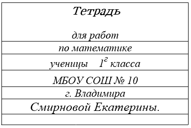 В продаже имеются тетради с различными оформлениями обложек: Для единого оформления тетрадей можно использовать наклейки (скачать шаблон наклеек можно ЗДЕСЬ). Наклейки приклеиваются на тетрадь и подписываются учителем. Обратите внимание, что предлог «по» пишется на одной строке с названием предмета; нумерация класса пишется арабскими цифрами; фамилия и имя пишутся в форме родительного падежа. Сначала пишут фамилию, а затем полное имя (Владимира, Николая, Анастасии и др.) * Не забудьте в шаблоне изменить литер класса, название школы, населённый пункт. Учителю останется дописать слог цы или ка и фамилию, имя ученика.