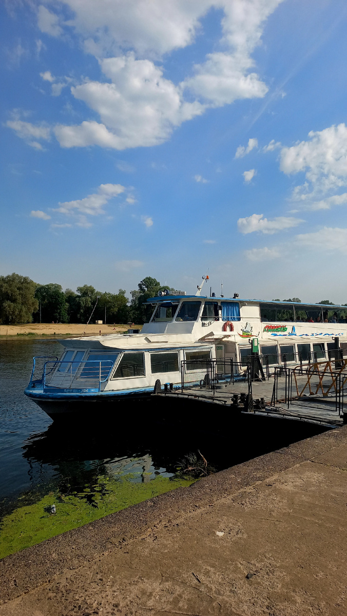 Всем привет🤗 На днях мы совершили прогулку на теплоходе в Гомеле по реке Сож⛴️ 📅Теплоход работает: в выходные и праздничные дни - с 12:00 до 19:30 в среду, четверг, пятницу - с 15:00 до 19:30. 💸Стоимость 40-минутной прогулки - 12 рублей с человека, дети с 5 до 10 лет - 6 рублей, дети до 5 лет - бесплатно. Приобретение билетов осуществляется на борту теплохода (оплата только наличными). Посадка на теплоход осуществляется с причала на Киевском спуске. Отправление в рейс производится по мере набора пассажиров, заполнения теплохода при условии наличия 30 взрослых пассажиров на борту. Нам очень понравилось такое нестандартное времяпрепровождение, было интересно посмотреть на привычные вещи, такие как река, пляж, мост, но под другим углом. И с погодой нам повезло, светило яркое солнце. По пути нам встретились байдарочники🛶, что было удивительно, ведь река Сож такая большая. Также на берегах реки видели много отдыхающих с палатками и, конечно же, рыбаков🐟. 🔹О теплоходе "Гомель" Теплохо