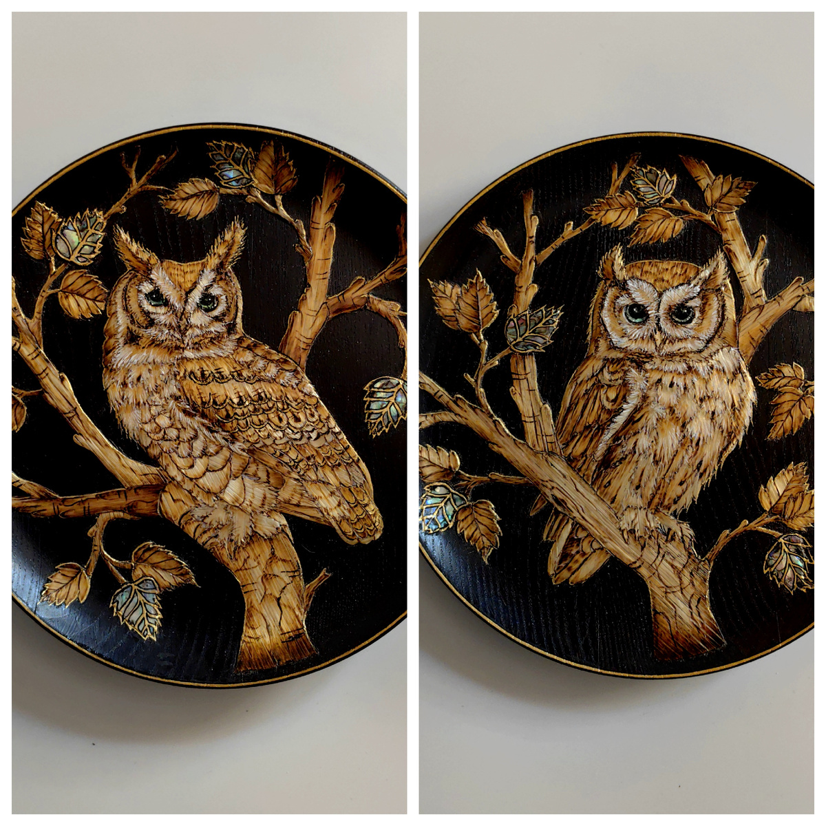 Недавно закончила работать над двумя не совсем обычными панно. Дело в том, что по задумке панно эти парные. Они и по отдельности хороши. Но вот когда видишь, как обе эти тарелочки смотрятся на стене, понимаешь, что украшать интерьер они должны непременно вместе, парой. Обе тарелочки выточены из клена. Самое интересное, что морилку для их затемнения использовала одну и ту же, морила их одну за другой, а цвет получился чуть разным. Хотя после декора этого и не видно уже Рисунок к ним придумался практически сразу - две совы, сидящие на ветках. Хоть и похожи на настоящих, но все же немного стилизованные. Любую работу с мозаикой я начинаю с основы из бумаги. Мои постоянные читатели конечно в курсе. Но всегда есть те, кто заходит на канал впервые. Так что немного поясняю, чтобы было понятно, зачем я наклеиваю на дерево бумагу. Один из постоянных вопросов, насколько прочно держится на изделии соломка. Не отлетит ли)) Вот для этого мне основа в частности и нужна - соломка держится на бумаге н