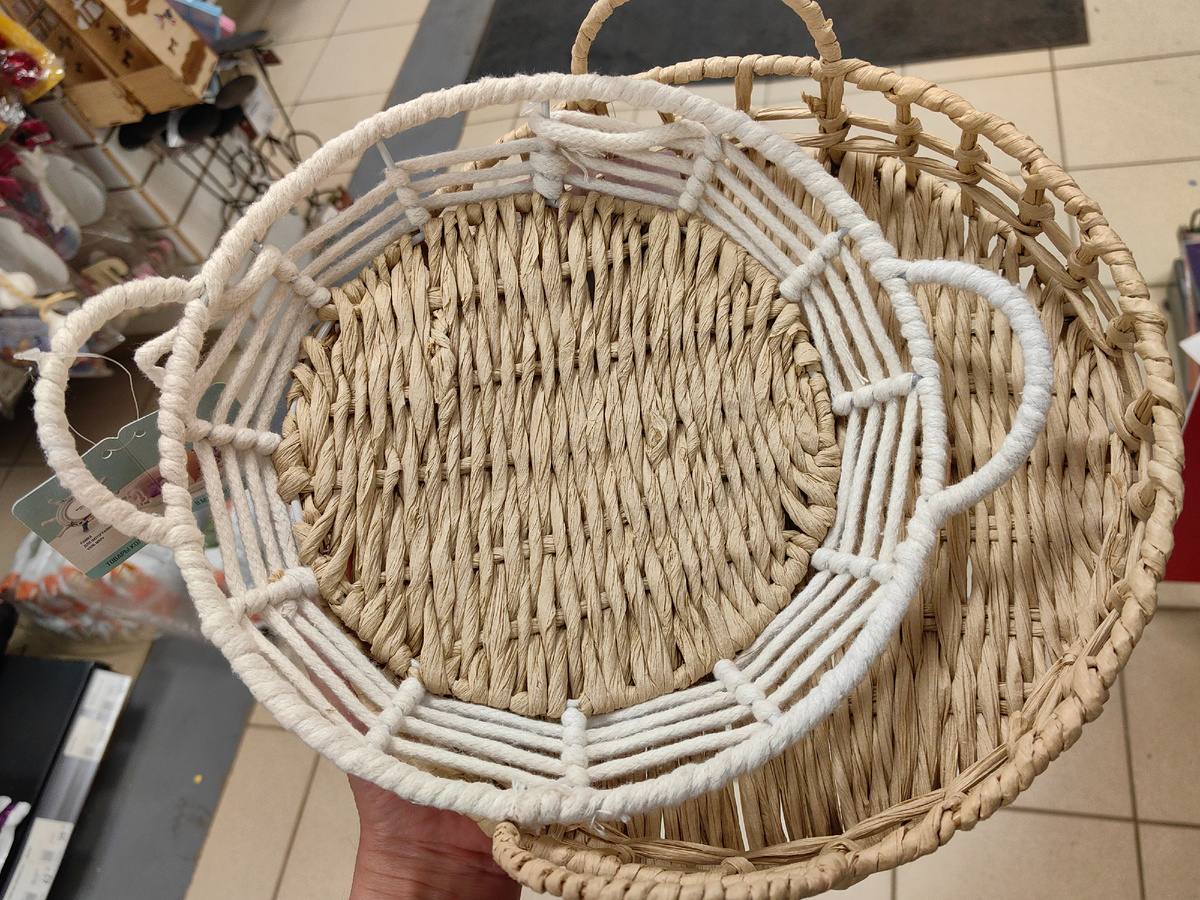 Здравствуйте! Была рядом с Фикс Прайс, дай, думаю, зайду, вдруг что привезли из новинок. Надо же, какие корзинки выставили. Стиль один, хотя коллекции разные. Та, что поменьше и с белым переплетением - из Морской. Вторая, побольше - из последней коллекция для декора, кстати, Петушок появился, покажу в обзоре! Переплетение у корзинок очень похоже, хотя, на самом деле материал разный. В первом случае это рогоз, корзинка чуть больше 25 см. А во втором случае для покрытия стального каркаса взяли бумагу. Обе корзиночки шикарные на вид, словно ручная работа, под разное можно использовать, от косметики до наполнения декоративными фигурками, можно в сочетании с веточками сухоцвета. Вторая корзинка больше, 29 см. Заявлена как поднос. Все может быть, единственное, точно не для посуды, просто поставить и наполнить небольшими предметами, не переставлять туда-сюда. Корзинки можно найти в отделе с товарами для праздника, по 249р и 399р. Вот он, Петушок, долгожданная новинка, декоративная фигур