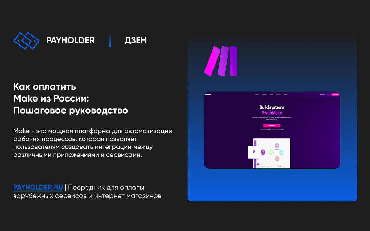 Make (ранее известный как Integromat) — это мощная платформа для автоматизации рабочих процессов, которая позволяет пользователям создавать интеграции между различными приложениями и сервисами. Однако пользователи из России могут столкнуться с трудностями при оплате подписки на Make из-за текущих ограничений. В этой статье мы рассмотрим, как оплатить Make из России с помощью PayHolder, чтобы продолжить использование всех возможностей этой платформы. Make — это платформа для автоматизации рабочих процессов, которая позволяет соединять различные приложения и сервисы без необходимости в программировании. С помощью Make пользователи могут автоматизировать рутинные задачи, интегрировать различные инструменты и создавать сложные сценарии для повышения эффективности своей работы. Автоматизация рабочих процессов Поддержка множества приложений Визуальный редактор сценариев Расширенные функции Облачное хранение Из-за текущих международных санкций и ограничений многие российские пользователи ста