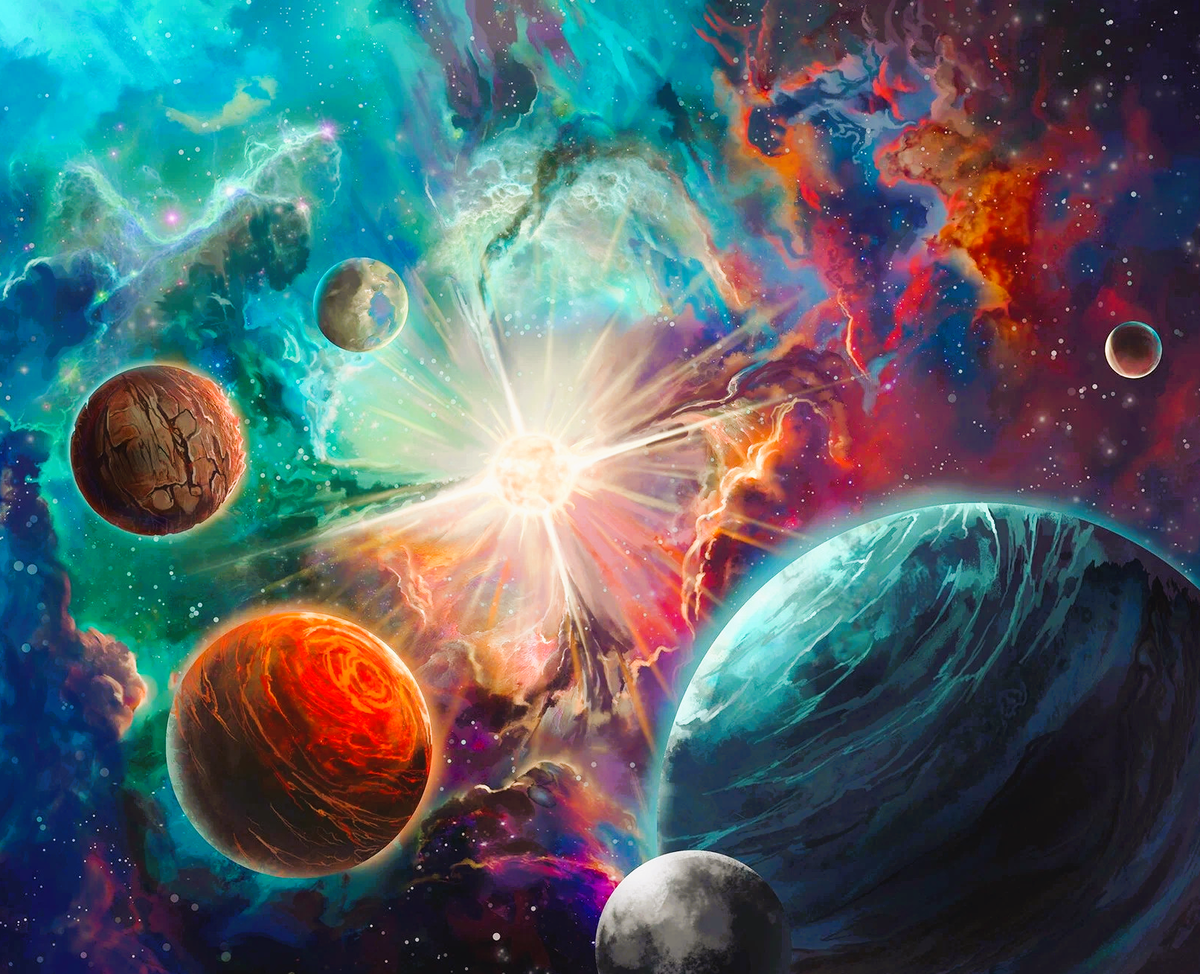 Притяжение у раскалённой планеты почти отсутствовало, судя по тому, как близко к её поверхности висели спутники. Их, этих спутников, было множество – неправильной конфигурации и самых разнообразных размеров, мерцающих в тусклом свете, как россыпи самоцветов из сказок Шахерезады про пещеру Сим-Сим. Вокруг тех, что были крупнее прочих, замечалась дымка собственной атмосферы.