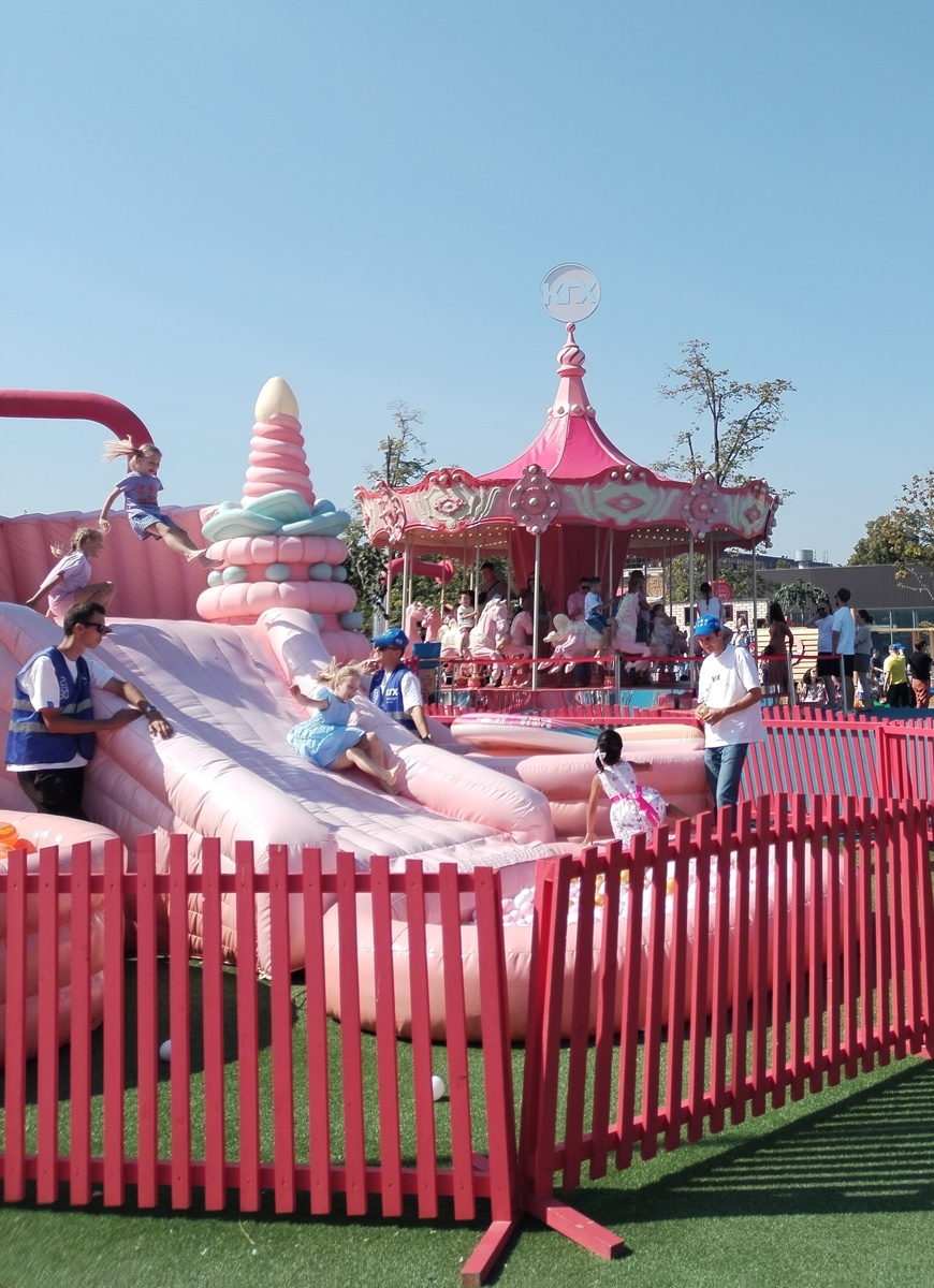 Попадая на выставку со стороны станции Спортивная, сразу же видим большую детскую площадку: настоящую сказку для непосед. Здесь находятся: надувные лазалки, домик с горкой, карусель. Качели и многое другое, где дети могут вдоволь выплеснуть свою энергию и порезвиться.