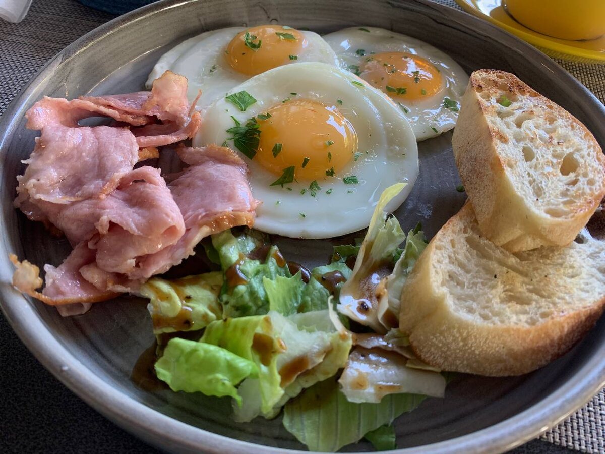 Все блюда завтрака мы «перемешали» и поделили, так как не смогли определить, кто чего больше хочет, да и порции там весьма приличные по размеру. Например, яичница с тостами и ветчиной почему-то состоит аж из трех яиц - столько мы можем съесть только на двоих)
