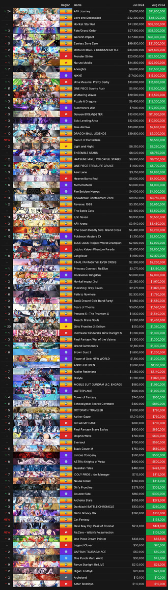 Ежемесячная статистика доходов гач на этот раз полна сюрпризов. Удивительным образом выстрелила AFK Journey. Да, в августе состоялся релиз игры в Японии, но чтобы он сразу принес СТОЛЬКО денег, подняв игру с 24 строчки на первую, — очень удивительно. Игры miHoYo продолжают терять доходы. И если в случае с “Геншином” в прошлом месяце была небольшая прибыль, “Хонкай” в августе "немного" потерял (речь о паре миллионов баксов, если что), но все равно располагается выше старшей сестры. А вот падение доходов Zenless Zone Zero сразу в три раза — это еще один повод удивляться. WuWa также продолжает терять доход, опустившись еще на 8 строчек по сравнению с прошлым месяцем. Симпатичная новинка августа, пиксельный тактикс Sword of Convallaria, стартовала на 25 позиции, заработав 8,5 миллиона долларов. Но мы напомним, что эта игра год назад вышла в Китае, а в прошлом месяце были глобальный релиз.