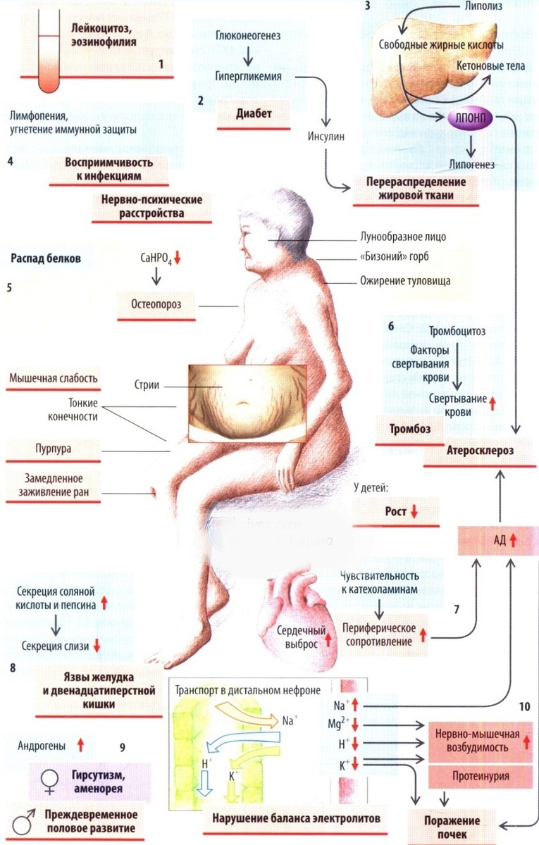 В основе заболевания лежит гиперпродукция кортизола или длительный прием препаратов ГКС. Важно отличать гиперкортицизм при синдроме Иценко-Кушинга от болезни Иценко-Кушинга, а также не забывать об АКТГ-эктопированном синдроме. О клинической картине, способах диагностики и принципах лечения можете прочитать в статье.