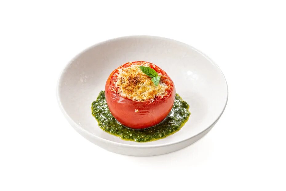 Рецепт — парафраз салата нисуаз, только в другой упаковке. Надо сказать, что в рецепте классического салата помидоры — основа в прямом смысле слова, на нарезанные кружками помидоры кладут все остальное: фасоль, тунец и каперсы. Но, поскольку нисуаз в помидорах мы запекаем в духовке, к оригинальному набору ингредиентов мы прибавили еще сыр и тимьян, чтобы усилить южный аромат и получить на выходе тягучую сырную корочку. И важный нюанс: не кладите в нисуаз в любом виде «пластиковые» помидоры из супермаркета, используйте настоящие, грунтовые, летние. 1.Подготовить все ингредиенты. 2.Вырезать у помидоров ножом сердцевину вместе с перегородками и семенами, оставив целые чашечки, которые можно будет начинять. 3.Все, что было вырезано из помидоров, мелко порубить. 4.Фасоль мелко нарезать, отварить в кипятке 2 минуты (или чуть больше, если она заморожена), сразу откинуть в миску со льдом, чтобы она сохранила цвет. 5.Слить жидкость из банки с тунцом, рыбу размять вилкой на небольшие кусочки. 6
