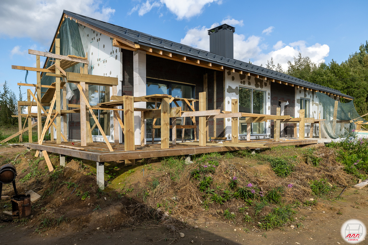 Всем хорошо известно, что в нашем регионе (СПБ и ЛО) газобетон D400 толщиной 400 мм не нуждается в дополнительном утеплении. Однако мы сейчас занимаемся утеплением такого дома: Используем пенополистирол ППС-16Ф размером 1,2х1,0х0,09 м, т.е. толщина слоя пенопласта составляет 9 сантиметров. При этом часть дома затянута ветрозащитной мембраной Ondutis Smart, а пенопласта там нет и не будет. Думаю, самое время показать узлы отделки фасада и всё сразу прояснится: Итак, фасад у нас будет комбинированный: штукарутка + вертикальный планкен. Штукатурка может быть нанесена прямо на стену, чего не скажешь о вертикальной обшивке деревом – ему нужна обрешётка, причём двойная чтобы обеспечить вентиляционный зазор. Давайте посчитаем: контробрешётка из доски 38*95 мм, обрёшётка из 20 мм дюймовки и вертикальная обшивка планкеном 20 мм, всё вместе получается почти 8 сантиметров. А пенопласт у нас 9 + штукатурка. Не сходится. А все почему? Потому что на чертеже не обозначены регулирующие проставки м