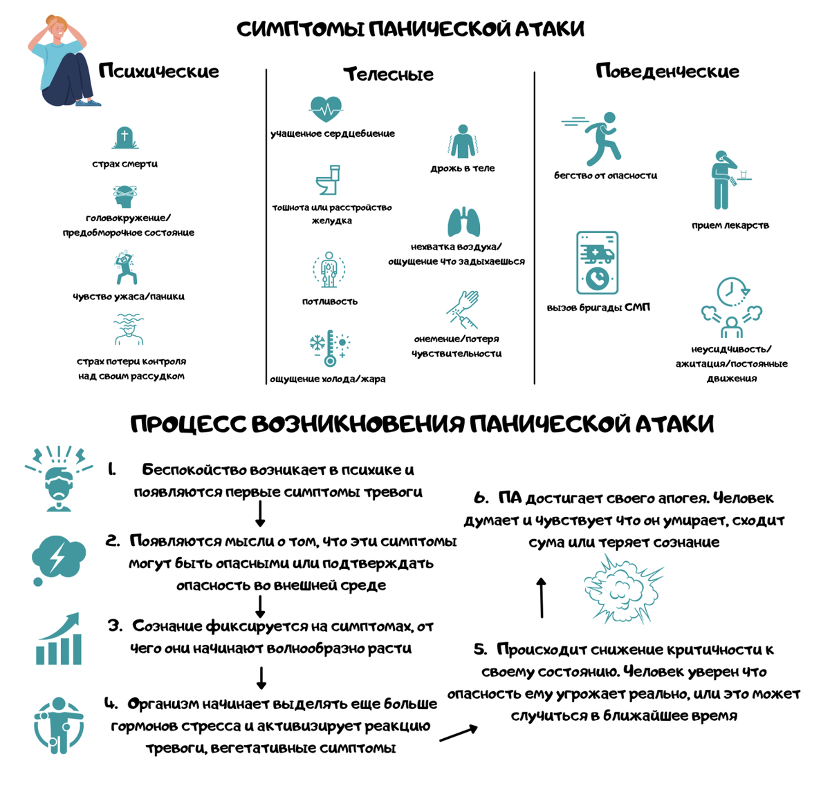 Образ опасности психикой создается, в первую очередь, для того, чтобы человек всячески избежал или убежал от опасности, не с целью нанести ему вред. Это функция адаптации организма при наличии вероятности опасности для жизни и здоровья. Причём не имеет значение насколько субъективно человек преувеличил эту опасность относительно реальной вероятности угрозы. Мы по умолчанию доверяем всему контенту эмоций и мыслей, который возникает в нашей психике. Чтобы человек смог убежать от опасности нужно, чтобы его организм работал на мышцы в первую очередь. Поэтому большинство симптомов во время ПА объясняются именно этим механизмом мобилизации. Например: учащенное сердцебиение, повышение артериального давления, чтобы к мышцам больше поступало кислорода и глюкозы, для повышения их КПД (коэффициента полезного действия). Учащение дыхания для увеличения поступления кислорода к мышцам и всему организму. Усиленное потоотделение для того, чтобы мышцы не перегревались и сохраняли максимальное КПД в своем рабочем диапазоне температуры. Дрожь в теле — это готовность к максимальным и резким физическим нагрузкам. Другие симптомы объясняются дисбалансом работы вегетативной нервной системы. В результате оттока крови к мышцам, сердечно сосудистой системе и легким человек может ощущать предобморочное состояние, головокружение. Активизация симпатического и/или парасимпатического отделов может создавать множество неприятных симптомов, например покраснение кожи, чувство холода или жара, онемение и покалывание, позывы на дефекацию и мочеиспускание, сухость во рту, ком в горле и т.д.