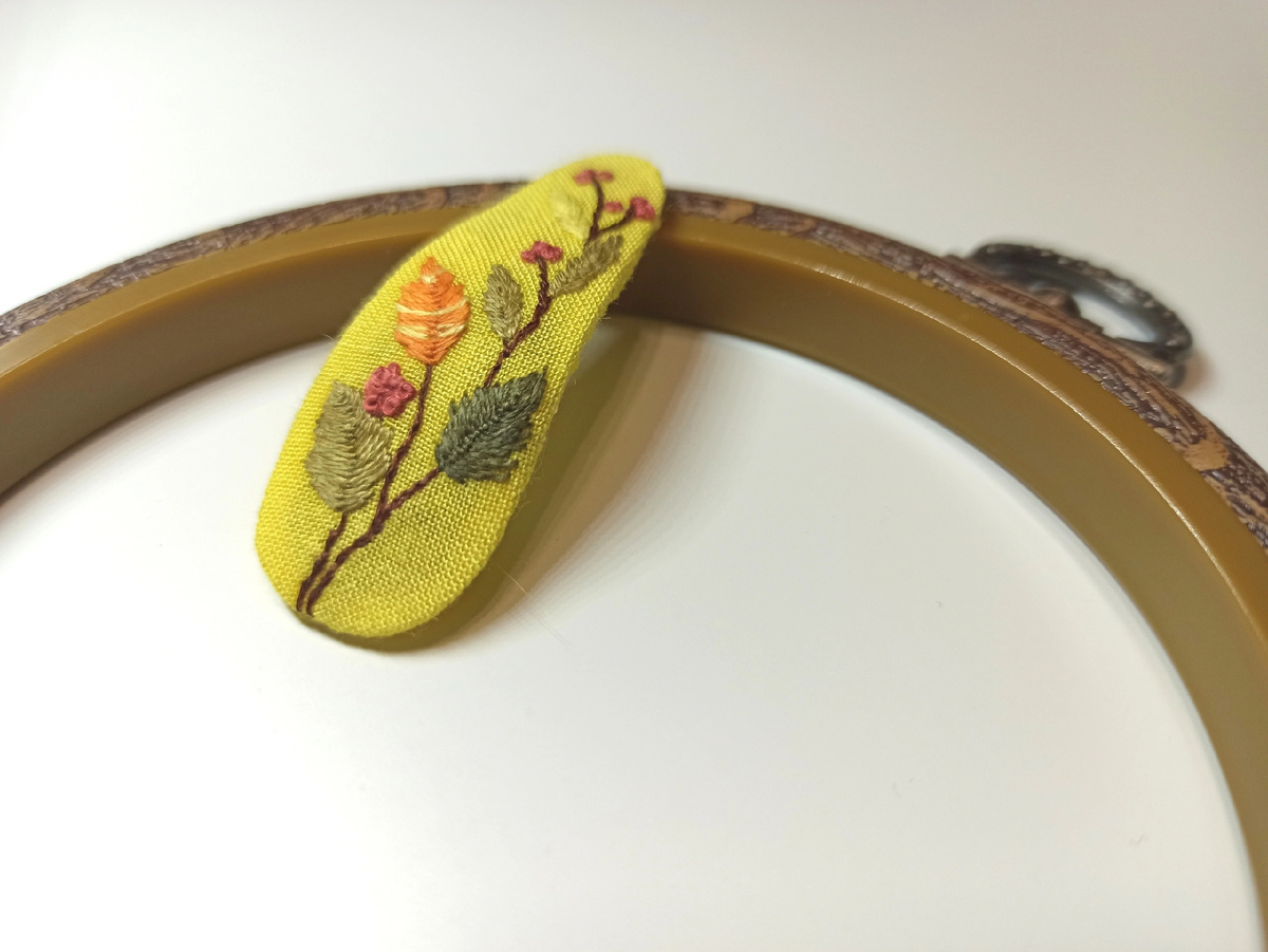 В первый день осени появилась вот такая заколка - тоже ручная вышивка, небольшой эксперимент. Вот здесь рассказываю и показываю, как вышивала котейку: Ткань беру 100% хлопок, для обработки обратной стороны использую фетр в цвет. Мотив вышивки простой - осень постепенно надвигается, зелёных листьев с каждым днём будет становиться всё меньше, а жёлтый цвет уже совсем скоро станет основным. А вы пользуетесь заколками "клик-клак"?