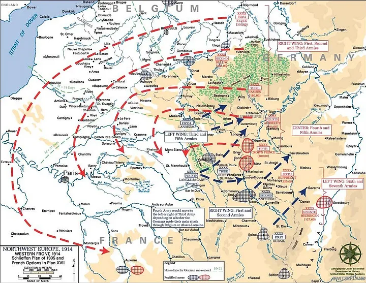 Возможно, нет военного документа, который был бы столь же тщательно изучен и обсужден, как План Шлиффена. Этот план, названный в честь фельдмаршала Альфреда фон Шлиффена, разрабатывался на протяжении десятилетий. Стареющий стратег постоянно его корректировал, сводя ужасы войны к нескольким линиям на карте и объемам таблиц и приложений. Даже после смерти Шлиффена план был приведен в действие в 1914 году. Великий замысел предполагал мощный «правый фланг», который должен был пройти через Бельгию и Нидерланды, чтобы нанести удар по Парижу и вывести Францию из войны всего за несколько недель.