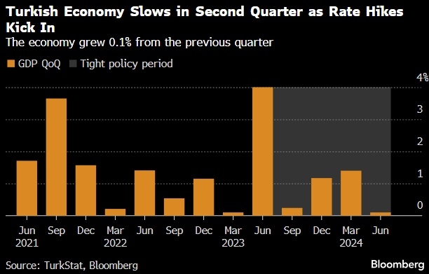 Экономический рост в Турции замедлился до самых слабых темпов со времен кризиса, вызванного коронавирусом, четыре года назад, подчеркивая, что процентные ставки в размере 50 процентов оказывают давление на бизнес и домохозяйства страны. Валовой внутренний продукт во втором квартале вырос на 2,5 процента в годовом исчислении по сравнению с пересмотренным показателем в 5,3 процента за первые три месяца этого года, сообщил в понедельник статистический институт Турции. Это самый медленный темп роста с момента резкого падения производства в середине 2020 года, свидетельствуют данные FactSet. Резкое замедление экономического роста Турции - один из самых ярких признаков того, что программа политиков по снижению бешеной инфляции наносит все более тяжелый урон экономике страны, стоимость которой составляет 1 млрд долларов. Валовой внутренний продукт, скорректированный с учетом сезонности и календарных эффектов, вырос на 0,1% во втором квартале, сократив темпы роста с 1,4% в предыдущем периоде.