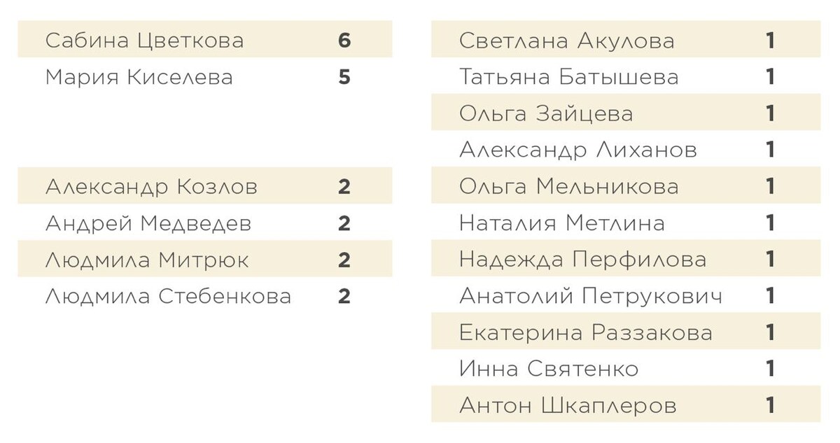 Абсолютным лидером нашего рейтинга стала Сабина Цветкова (ВАО, Богородское, Метрогородок, Сокольники и часть района Гольяново) — шесть попаданий в топ из шести возможных. На втором месте — Мария Киселева (СЗАО/ЗАО, Строгино, Щукино, часть района Покровское-Стрешнево, часть района Кунцево)] — пять попаданий из шести. На третьем месте — четверо кандидатов с двумя попаданиями в рейтинг: Александр Козлов (ТиНАО), Андрей Медведев (САО), Людмила Митрюк (ВАО), Людмила Стебенкова (ЮВАО).