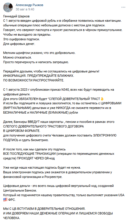 В сети расходятся конспирологические посты о том, что Сбербанк якобы тайно переводит своих клиентов на цифровой рубль, предлагая подписать «слепой доверительный траст». Утверждается, что после этого человек уже никогда не сможет пользоваться наличными или безналичными деньгами. Этот фейк ходит в сети с пошлого года. С определенной периодичностью подобные спам-рассылки появляются в соцсетях.