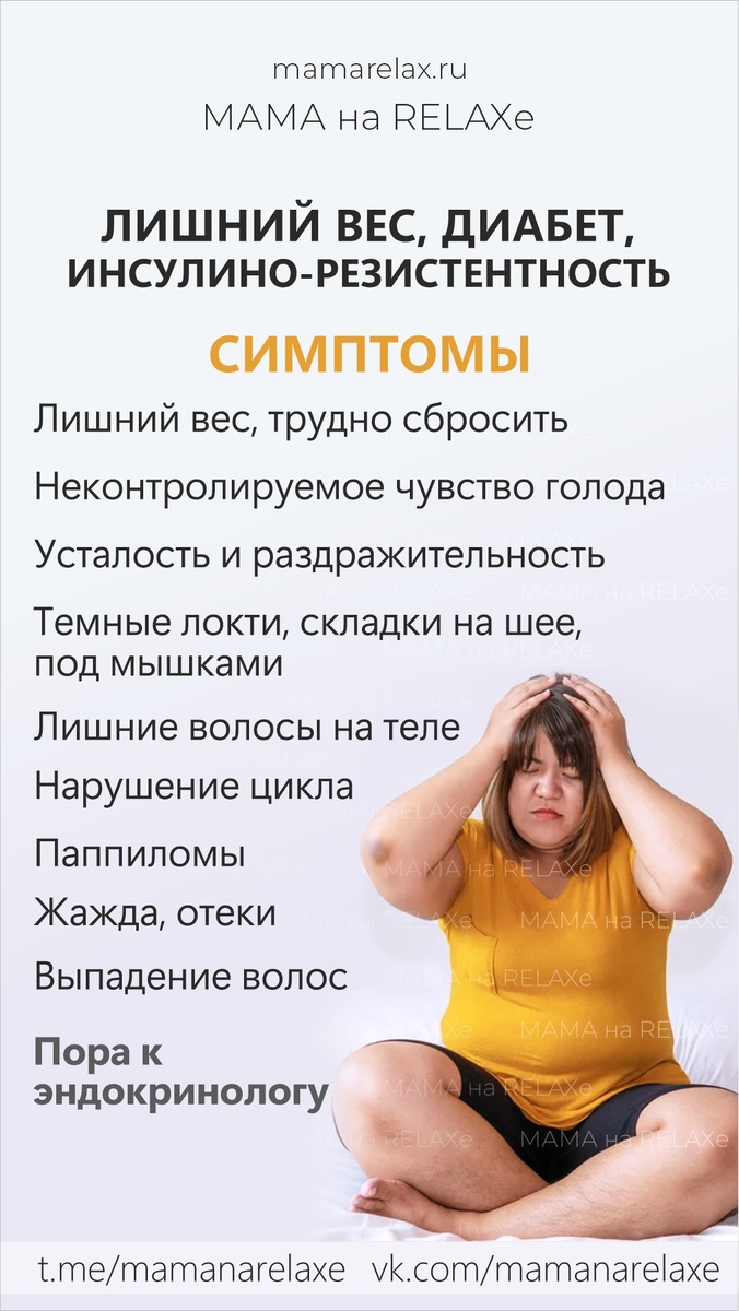 Определить, есть ли у тебя лишний вес, можно с помощью индекса массы тела (ИМТ). В интернете ты легко найдешь специальные калькуляторы, которые помогут рассчитать этот показатель. Если твой ИМТ превышает 25 и ты наблюдаешь симптомы, описанные в слайде, рекомендуется посетить врача и сдать анализы. Чек-ап при лишнем весе и диабете есть в статьях https://vk.com/@mamanarelaxe-chek-ap-pri-lishnem-vese-diabete-ili-insulinorezistentnosti