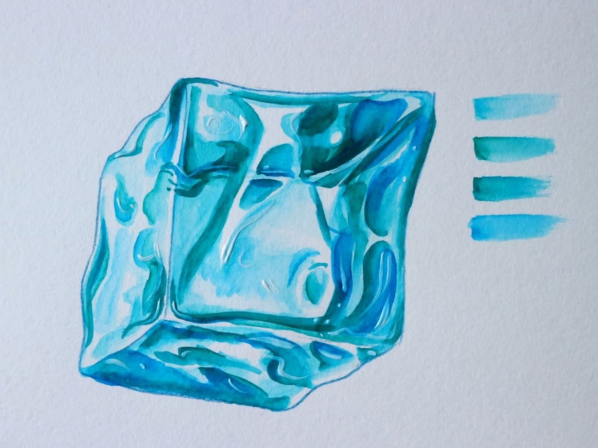 Холодные цвета: как нарисовать кубики льда и передать объем с помощью акварели? Рисуем лед с помощью акварельных маркеров. Простой пошаговый рисунок. Сегодня мы пошагово рассмотрим один из способов рисования льда. С помощью нескольких оттенков синего и голубого цвета мы передадим глубину и прозрачность кубика. Из материалов я использую акварельные маркеры (можно заменить акварелью), бумагу для акварели и кисть с резервуаром. Дополнительные материалы: карандаш, клячка, синий карандаш, белая акриловая краска. Для начала я карандашом набрасываю куб. Необязательно соблюдать четкие правила построения, ведь у кубика льда будут неровные ребра, как будто он немного подтаял и имеет волнистые поверхности. После этого я стираю набросок с помощью клячки, чтобы контур был еле заметен (можно использовать обычный ластик). Обвожу контур синим карандашом волнистыми линиями. Дальние ребра обвожу не везде, чтобы не создавалась путаница какая грань ближе, а какая дальше. Приступаю к первому слою покраса.