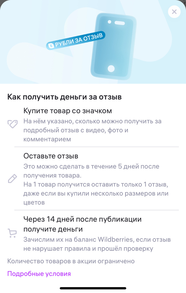 Для тех, кто еще не знает: в мае 2024 года Wildberries запустил новую акцию «Рубли за отзыв». Далее будем разбираться в основных условиях акции и приведем более подробную инструкцию, как именно оставить отзыв. Сколько можно заработать на отзывах? За один отзыв можно получить от 200 до 3000 баллов - это максимальная сумма платы за отзыв, которую я встречала. Но на такие акции к сожалению я не успевала и максимально мне удавалось получить 650 баллов. При этом можно найти товары, за которые платят более 100% от стоимости самого товара. Получается, что товар вы получаете бесплатно и еще зарабатываете на этом. Условия акции на сайте Wildberries Вроде все коротко и ясно: Но так ли все просто на самом деле?! Так как акция новая, у покупателей много вопросов. Но к сожалению поддержка на эти вопросы дает противоречивую информацию. Поэтому разберем их вместе, основываясь на нашем опыте покупок по данной акции. Как оставить отзыв? После того как забрали товар с ПВЗ нужно дождаться, когда в