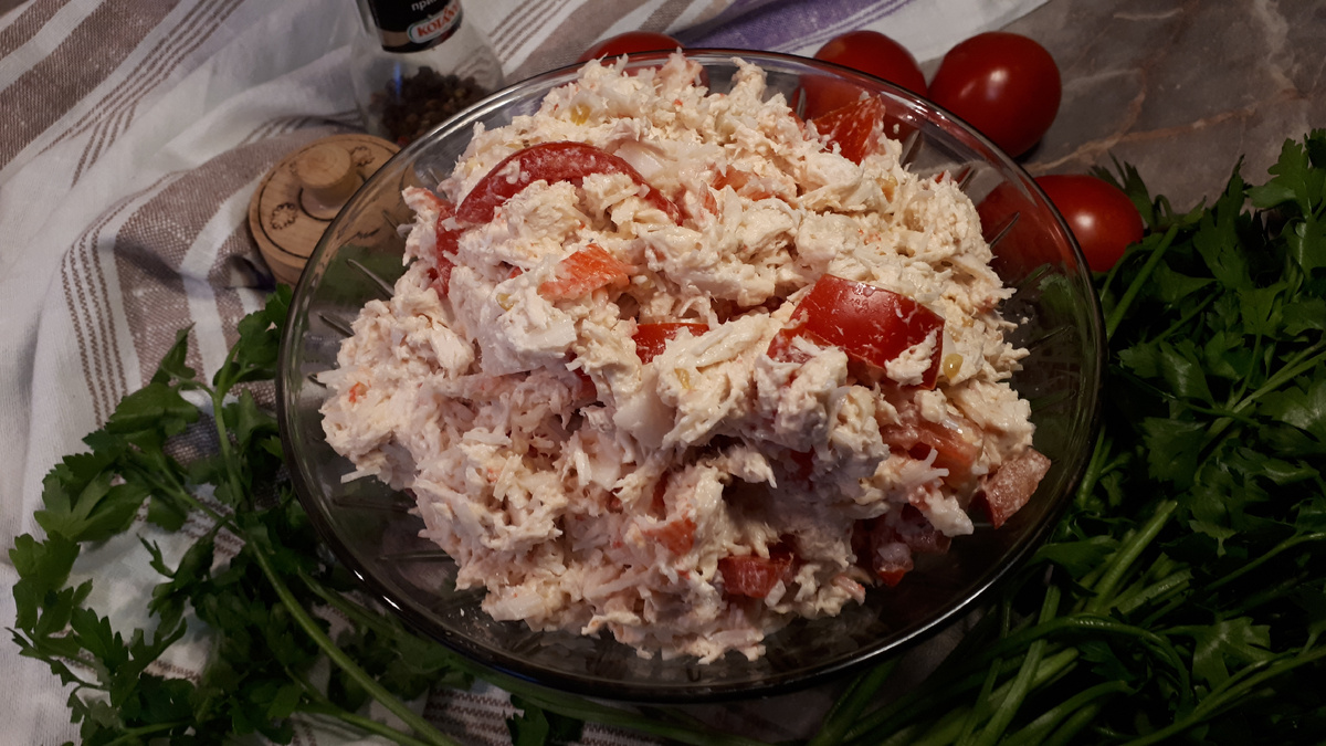 Сегодня я решил поделиться рецептом очень вкусного салата, так сказать моего фаворита, на все праздники я его готовлю. Впервые я его попробовал в гостях, если знаете его название то буду рад услышать). Готовится очень просто, он очень сытный и у меня дома его съедают "на ура". Всего несколько ингредиентов, которые можно найти в холодильнике у каждого. Самое долгое - это отварить куриную грудку, а остальное всё очень быстро и просто. Очень советую попробовать, он нереально вкусный. Мне тоже казалось странным и "несочетаемым" сочетание курицы и крабовых палочек, но это только так кажется на первый взгляд. Крабовые палочки упаковка