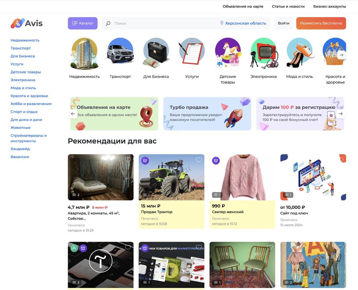 В эпоху цифровых технологий и глобальной связанности, каждый шаг в новом направлении, открывает перед нами бесконечные возможности. Именно таким шагом стало появление первой площадки для объявлений в Херсонской области - 24Avis. Этот инновационный проект не только предоставляет уникальную возможность для обмена информацией и услугами, но и создает новое пространство для взаимодействия и развития сообщества, а также привносит в регион новые перспективы и возможности для всех желающих объединиться в едином цифровом пространстве. Приглашаем вас присоединиться к этой новой площадке и открыть для себя мир новых возможностей и перспектив. Зарегистрировавшись на сайте 24Avis, Вы сможете добавлять объявления, как от частного лица, так и открыть свой онлайн-магазин. В личном кабинете у Вас есть возможность управлять публикациями, подключать тарифы, для повышения показов и более быстрого заключения сделок. А также Вам доступна статистика, в которой можете отследить количество показов, просмотров