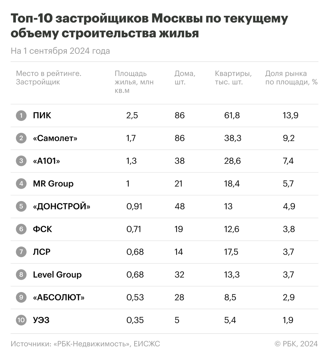Группа компаний «ПИК» сохранила первое место среди девелоперов по текущим объемам строительства жилья в Москве. Это следует из рейтинга «РБК-Недвижимости», составленного на основе данных Единой информационной системы жилищного строительства (ЕИСЖС). На начало сентября 2024 года ГК «ПИК» строит в столице 86 жилых домов (61,8 тыс. квартир) общей площадью 2,5 млн кв. м. Проекты лидера занимают 13,9% в общем объеме возводимых новостроек в Москве. На втором месте оказалась ГК «Самолет», которая реализует 1,7 млн кв. м (86 домов, 38,3 тыс. квартир) и занимает 9,2% на столичном рынке новостроек. Третье место у ГК «А101» (1,3 млн кв. м, 38 домов, 28,6 тыс. квартир), ее доля составляет 7,4%. На четвертом месте компания MR Group, доля которой на столичном рынке составляет 5,7%. Девелопер строит 1 млн кв. м в 21 доме на 18,4 тыс. квартир. Замыкает первую пятерку рейтинга компания «Донстрой», возводящая 914 тыс. кв. м (48 домов, 13 тыс. квартир) и занимающая 4,9% в общем объеме жилищного строитель