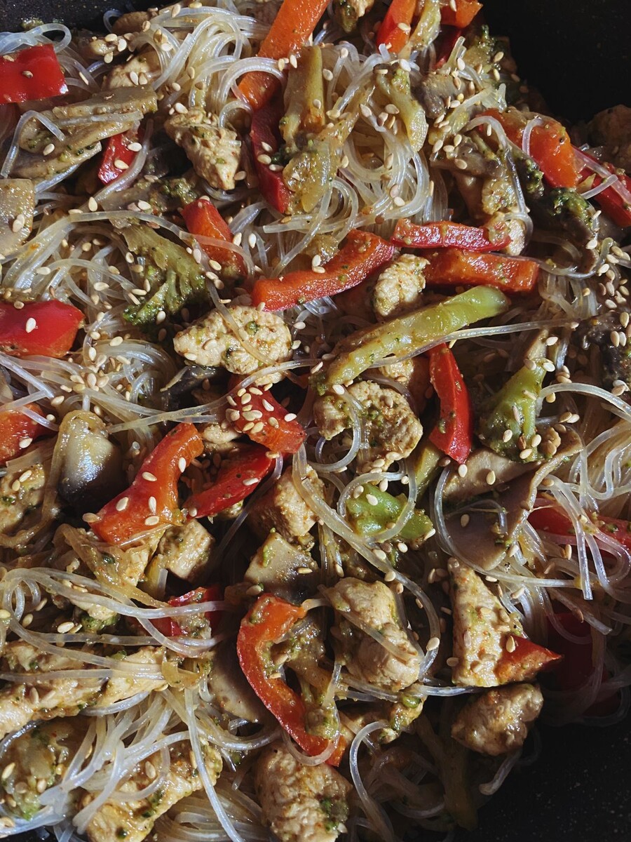 Всем привет. Сегодня расскажу, как я готовлю вкусное блюдо для своей семьи. Ингредиенты, которые нам понадобятся: Приготовление: Шаг 1 Фунчозу укладываем в кастрюлю и заливаем кипятком, оставляем минут на 10 до приготовления. Через 10 минут сливаем воду и промываем холодной водой. Шаг 2 Фунчозу нарезаем кухонными ножницами на кусочки и откладывем в сторону. Шаг 3 Куриное филе нарезаем небольшими кусочками и обжариваем на растительном масле до румяной корочки. Шаг 4 Шампиньоны нарезаем тонкими пластинами и также обжариваем на растительном масле( отдельно от курицы). Шаг 5 Лук нарезаем тонкими полукольцами. Шаг 6 Перец нарезаем тонкой соломкой,а брокколи на небольшие кусочки. Шаг 7 В сковороду наливаем растительное масло, разогреваем. Сначала обжариваем лук, далее к нему добавляем перец и брокколи. Шаг 8 К овощам добавляем обжаренную курицу и шампиньоны, все хорошо перемешать. Добавить соевый соус и специи. Посолим и поперчим по своему вкусу. Тушить все вместе около 5 минут. Шаг 9 В с