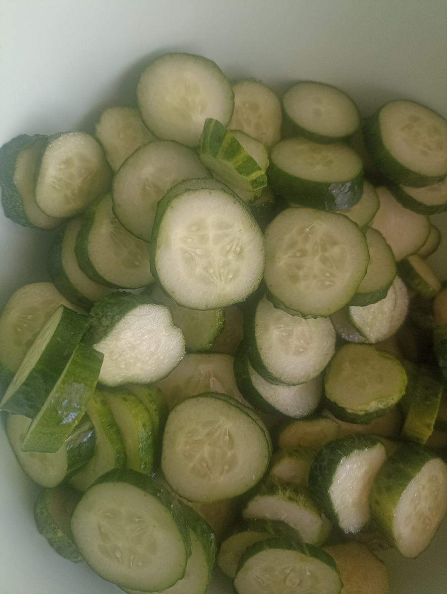 Это очень простой и вкусный рецепт, такие баночки уходят очень быстро. Огурцы сюда любые подойдут. Если молоденькие - нарезаю с кожицей, если переросшие - очищаю и убираю семена. Огурцы мою и нарезаю кружочками. Можно, конечно, нарезать и кубиками, и брусочками, но у меня кружочки! Теперь важный момент - рецепт у меня рассчитан именно на пол-литровые баночки. Так и есть потом удобнее)) Количество ингредиентов указано на банку объемом 0,5 литра (используйте именно такие банки)! • Огурцы ~ 300 г (сколько помещается, столько и укладываю!) • Укроп - 2 веточки • Чеснок - 1-2 зубч. • Перец черный (горошком) - 2-3 шт. • Семена горчицы (зерна) - 1/4 ч.л. • Соль - 1 ч.л. • Сахар - 2 ч.л. • Уксус 9% - 1 ст.л. • Масло растительное - 1 ст.л. Банки я предварительно стерилизую в микроволновке. Считаете, что стерилизовать - лишнее, не делайте этого. Но мне не сложно потратить 3 минуты и мне так спокойнее. На дно каждой баночки выкладываю укроп, чеснок, черный перец и зерна горчицы. Зерна горчицы
