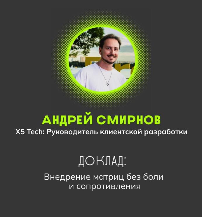 Андрей Смирнов 🔘 Место работы: X5 Tech 🔘 Должность: руководитель клиентской разработки 🔘 Стаж: 8 лет руководства + 7 лет разработки 🔘 Зона ответственности: People manager 220 человек по компетенциям JavaScript и мобильной разработки (Kotlin, Swift) 🔘 Интересы: ведущий подкастов Frontend Weekend и «600k в секунду», участник ПК Frontend Conf и Podlodka TL Crew, путешественник, осознанный гедонист, амбассадор софт скиллов - @itsmirnov 🔘 Доклад: Внедрение матриц без боли и сопротивления О чём доклад? Каждый из нас сталкивался с процессами вроде матриц компетенций и систем грейдов. Часто оказывается, что они внедрены так, что никто не понимает, зачем они нужны. Мне бы хотелось на собственном опыте и зарубежных компаний рассказать, как внедрение провести так, чтобы всем было приятно, прозрачно и понятно Накидайте Андрею огоньков 🔥 Регестрируйтесь на конференцию, чтобы лично пообщаться с золотым голосом IT и задать ему любой вопрос 🤩