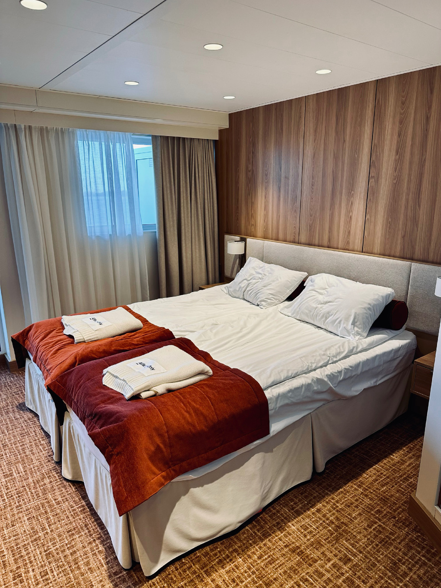 Каюты просторные и уютные, оборудованы всем необходимым для комфортного проживания: холодильник, кофемашина, фен, сейф, тапочки, халат, пополняемая вода в каждой каюте. Ключ — магнитные карточки.