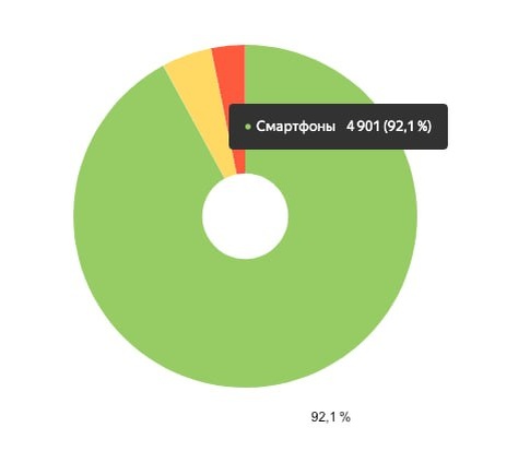 Теперь обратимся к статистике и выясним, какой тип устройств доминирует как средство выхода в интернет. Для примера мы взяли некоторые сайты, разработанные нами для наших клиентов. Метрики показывают распределение просмотров сайта с мобильных устройств и с компьютеров (ноутбуков).