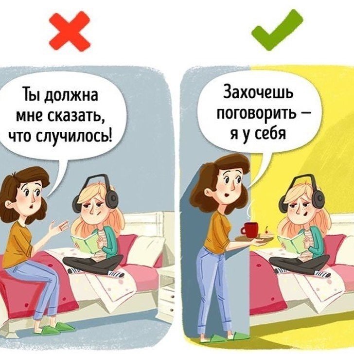 Эта рекомендация – прямое продолжение предыдущей. Мы не оцениваем поступки ребенка, не говорим, как нужно было сделать и тем более, при его неудачах, мы не говорим «А я же говорил/ла!». Если очень уж сложно молчать, можно задать вопрос: «Как ты думаешь, к чему приведет, если ты поступишь так?» И дальше уже слушать его ответ. Ведь все решения у него уже есть внутри. Это уже личность, он может самостоятельно размышлять и находить верные пути. А ваши не прошеные советы ему не нужны. Вы на двадцать с лишним лет его старше, в его глазах вы вообще динозавр, который ничего не понимает. Смиритесь и подождите, это пройдет.
