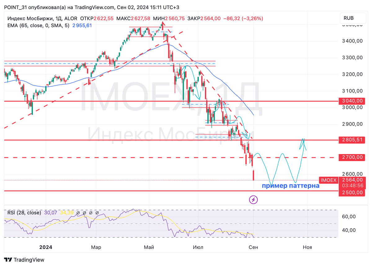 Друзья, я так понял рубрика с кратким обзором текущего положения дел на рынке вам понравилась. Пока продолжается «мясорубка», постараюсь чаще делиться с вами своими комментариями. Итак, Индекс Мосбиржи продолжил в начале недели отвесное падение, теряя на середину дня больше 3%. Напомню, что индекс - это всего лишь отражение тех активов, которые входят в него. Так вот эти самые активы снижаются широким фронтом, кроме Газпрома 😂 Вот оно, достояние нашего рынка. Что по технике? Мы с вами в пятницу отрисовали возможную разворотную модель и следующий уровень поддержки. Он располагается на 2500 п., к которому мы как раз и пытаемся добивать. Видимых причин к сильным распродажам нет. В таких случаях я обычно говорю, что рынок служит опережающим индикатором тех событий, которые нас ждут в ближайшее время. Думаю, что новости не заставят себя ждать. 💬Я ни в коем случае не армагеддоню. Это я делал в начале года, когда мои эфиры прерывались ракетными атаками, а в перерывах между ними я смотрел